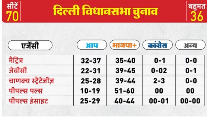 Exit Poll Delhi: मैट्रिज एग्जिट पोल के अनुसार दिल्ली में इस बार भाजपा को बढ़त मिलती हुई नजर आ रही है। एजेंसी ने आप को 32 से 37, भाजपा को 35 से 40 और कांग्रेस को 0-1 सीट दी है।