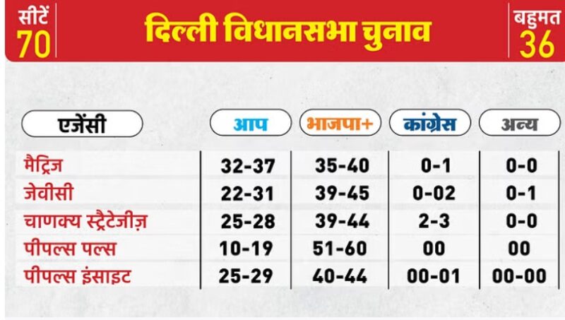 पीपल्स इनसाइट पोल के अनुसार दिल्ली में इस बार भाजपा को 25-29, आप को 40-44 और कांग्रेस 0-1 सीट पर बढ़त मिलती हुई नजर आ रही है।