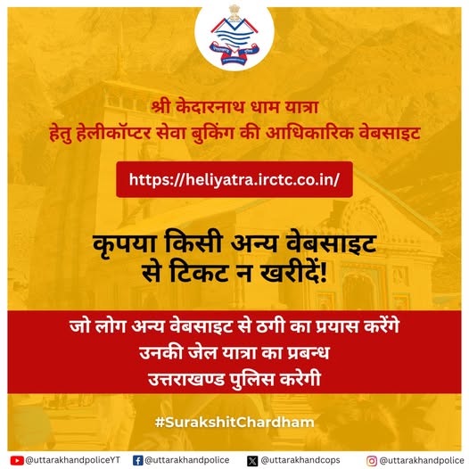 - फेसबुक विज्ञापनों और व्हाट्सएप मैसेज के जरिए हो रही फर्जी हेलीकॉप्टर बुकिंग से सावधान रहें