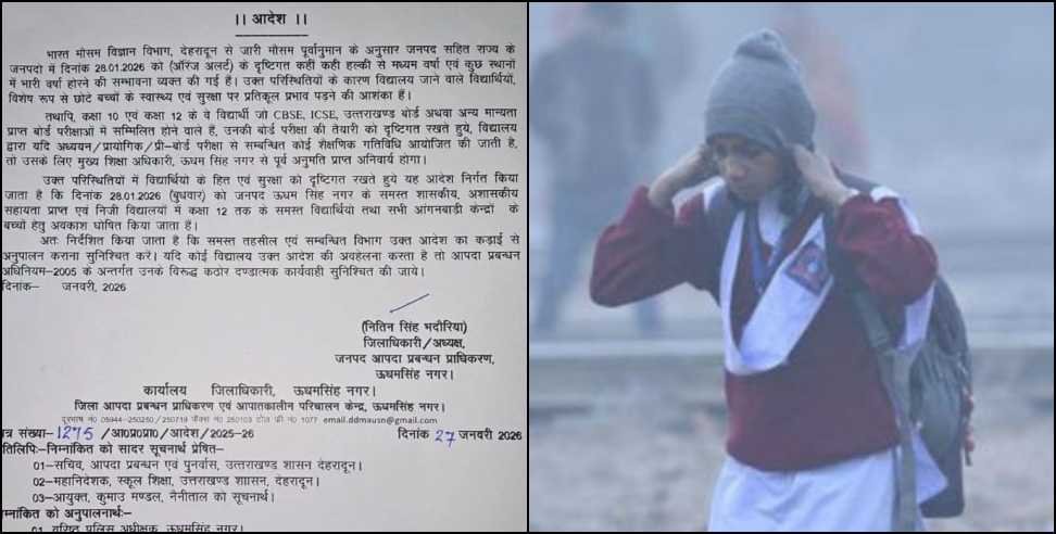 प्रशासन ने यह कदम संभावित खराब मौसम, जैसे तेज बारिश, ठंड और अन्य प्रतिकूल परिस्थितियों के मद्देनज़र उठाया है, ताकि छात्रों की सुरक्षा सुनिश्चित की जा सके। मौसम विभाग की चेतावनी के अनुसार, इन जिलों में मौसम का असर स्कूल आने-जाने पर जोखिम बढ़ा सकता है। मौसम पूर्वानुमान के चलते 28 जनवरी 2026 को रुद्रप्रयाग, ऊधमसिंह नगर, पिथौरागढ़, टिहरी गढ़वाल और देहरादून जिलों में कक्षा 1–12 के सभी सरकारी-निजी स्कूल और आंगनबाड़ी केंद्रों में अवकाश घोषित कर दिया गया है।